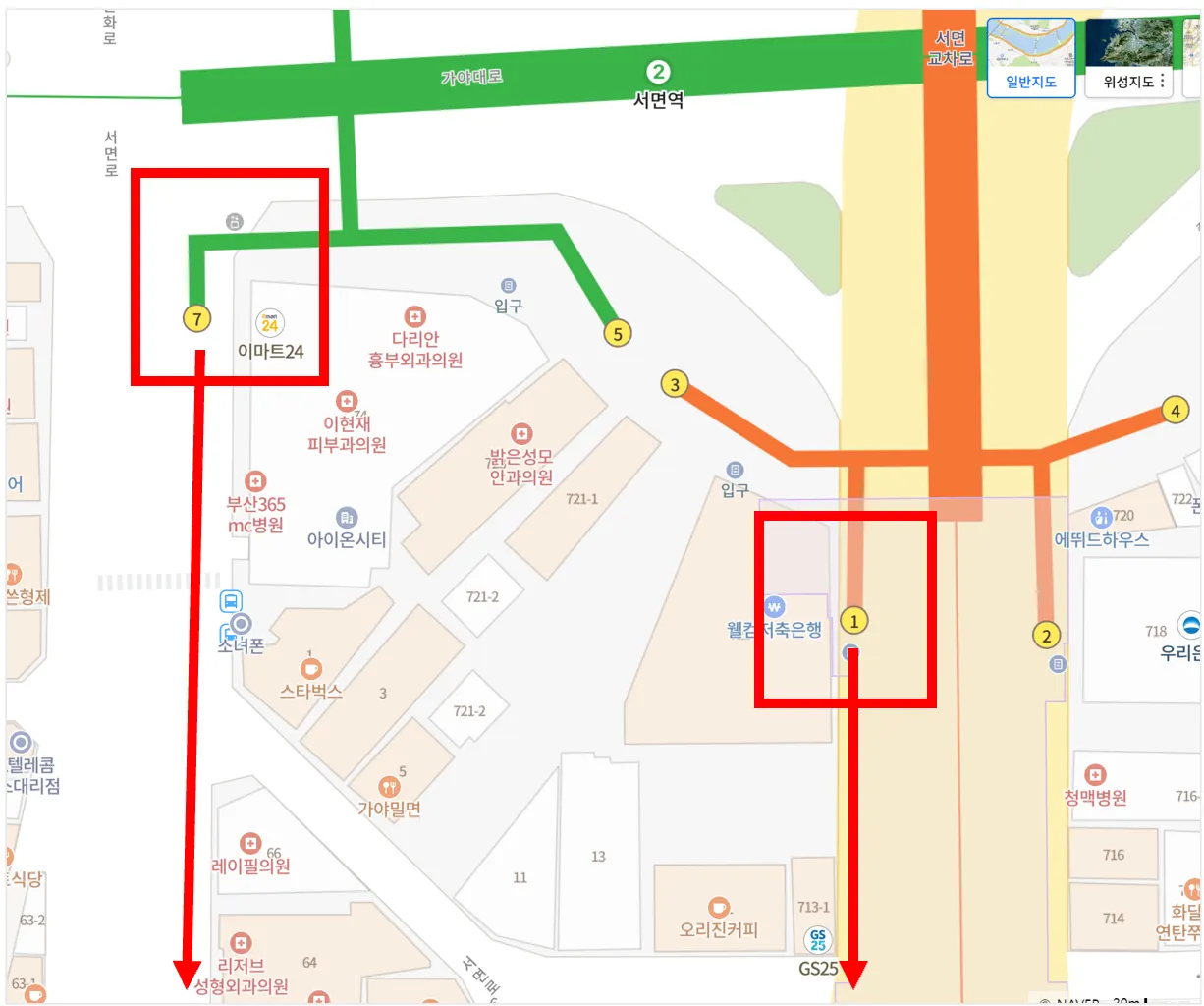 Busan station → Take subway Line 1 → Get off at Seomyeon Station → Exit 1